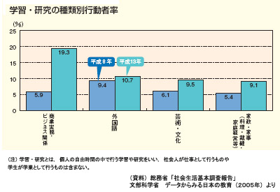 文部科学省が発表した「データからみる日本の教育(2005年)」によると、平成8年と平成13年とで個人の自由時間の中で行う学習・研究の行動者率を比較すると、「商業実務・ビジネス関係」が前回を大きく上回っていることがわかる。