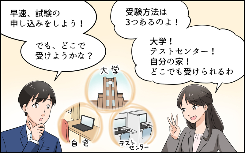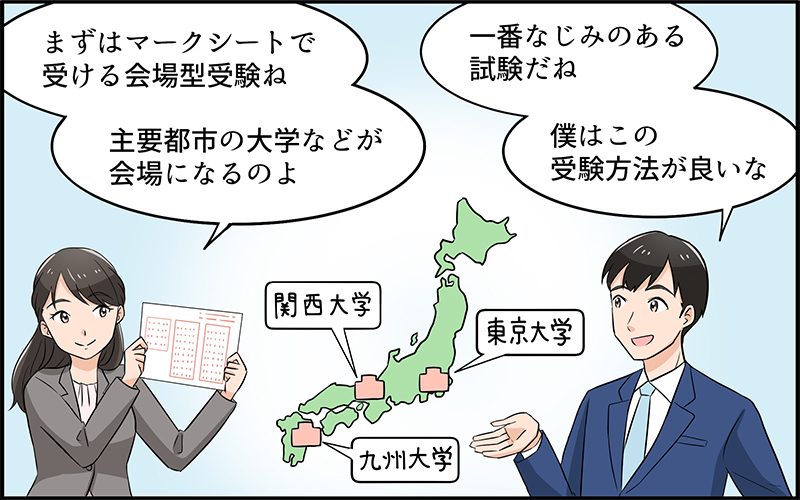 昨今の試験の実施方法には色々なタイプがあります。従来からある大学などで受験する「会場試験」が一般的ですが、コロナ騒動以来、急速に増加してきた「CBTテストセンター会場」や「オンライン試験」などがあります。